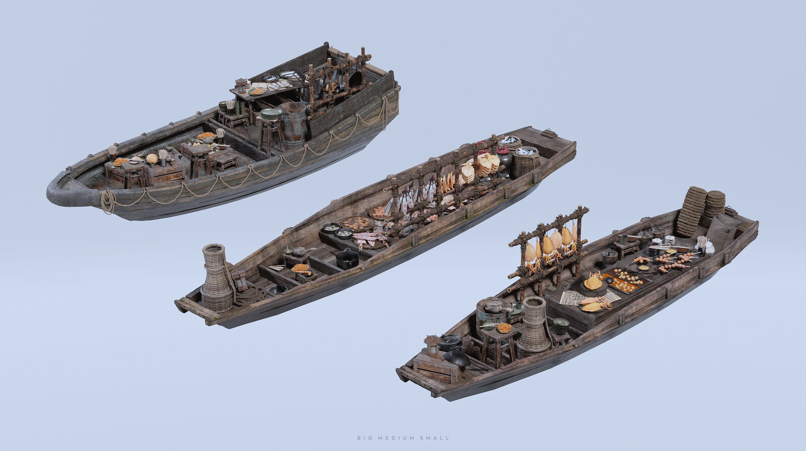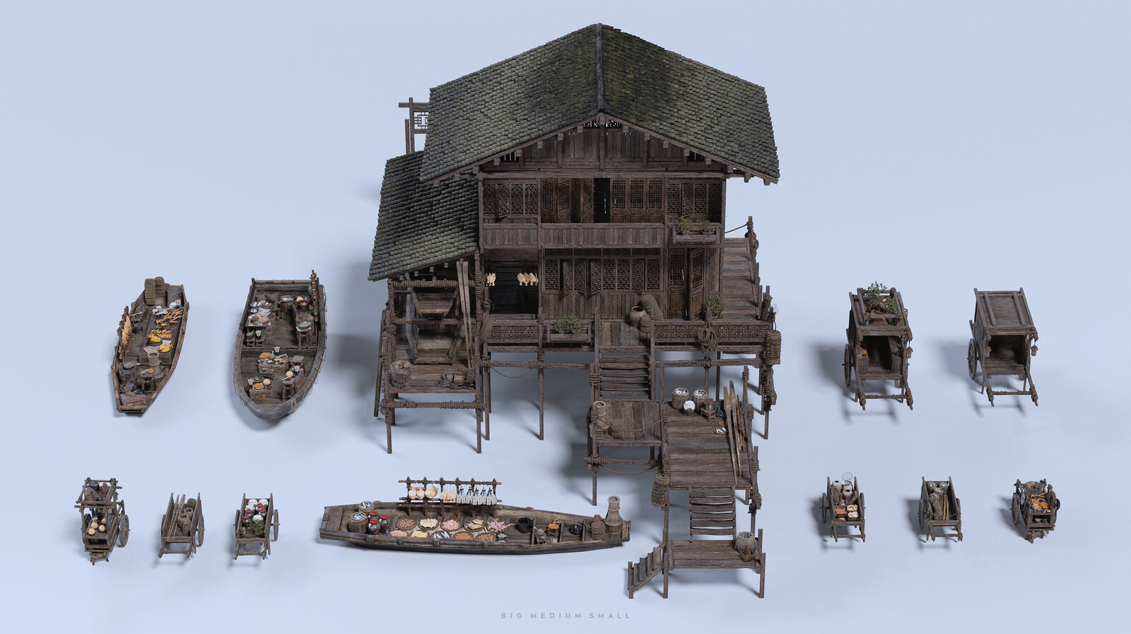 Some new assets I've designed for an update to the BMS Water Village kitbash set, which is out now! A new boathouse, market and restaurant sampans, rickshaws, food and transport carts.